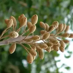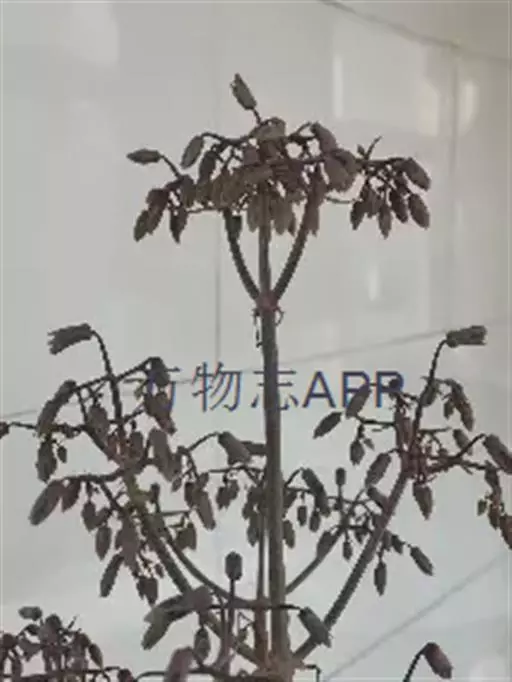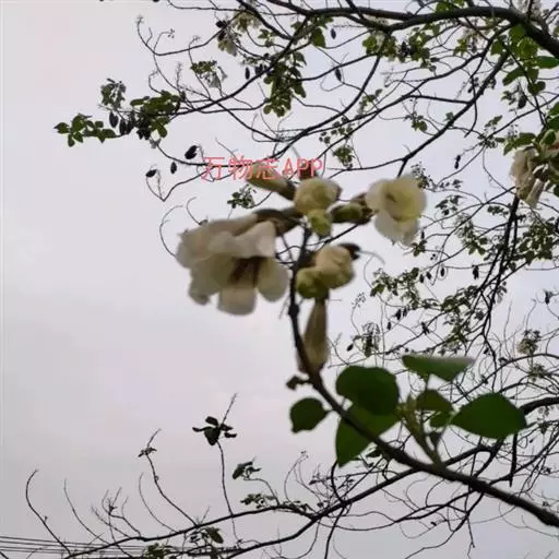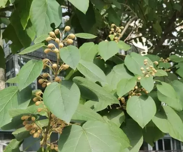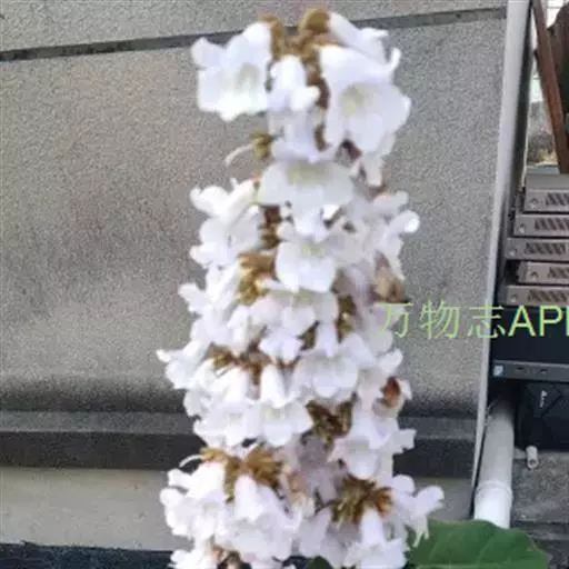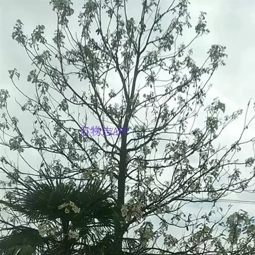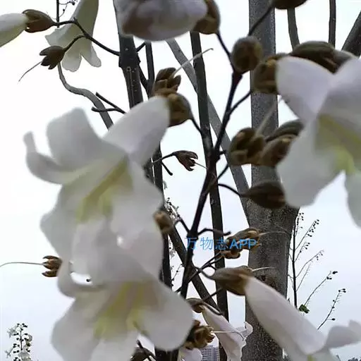 1.泡桐,乔木,高达30m。树皮灰褐色,幼枝、叶、叶柄、花序各部及幼果均被黄褐色星状绒毛。叶柄长达12cm;叶片长卵状心脏形,长可达20cm,先端长渐尖或锐尖头,基部心形,全缘。花序狭长几成圆柱形,长约25cm;小聚伞花序有花3-8朵,头年秋天生花蕾,先叶开放;总花梗与花梗近等长;花萼倒圆锥形,长2-2.5cm,5裂达1-3,裂片卵形,果期变为狭三角形;花冠管状漏斗形,白色,内有紫斑,长达10cm,筒直而向上逐渐扩大,上唇较狭,2裂,反卷,下唇3裂,先端均有齿痕状齿或凹头;雄蕊4,二强,隐藏于花冠筒内;子房2室,花柱细长,内弯。蒴果木质,长圆形,长6-10cm,室背2裂。种子多数,扁而有翅。花期2-3月,果期8-9月。