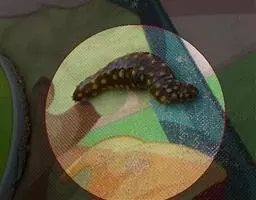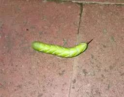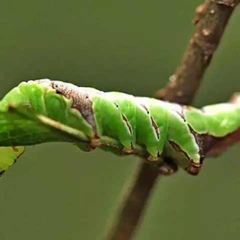 新孵化的幼虫为透明黄色,第二龄幼虫呈绿色。幼虫是绿色的,两侧有两个灰色条纹,在乳白色的边缘,乳突的典型尾部有角。口器为紫红色,最后一龄变成橘红色,呈蓝色。它们的食物完全暴露在寄主植物的顶部,并在缠在一起的茎中休息。尽管取决于温暖和阳光,但幼虫期可能会长达20天。