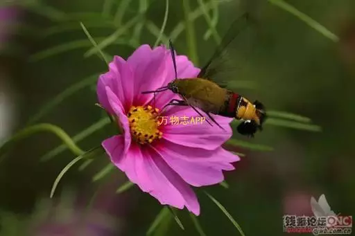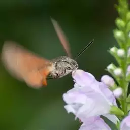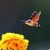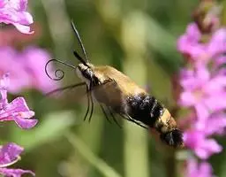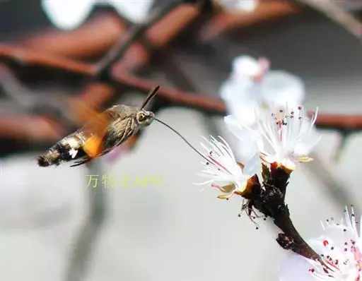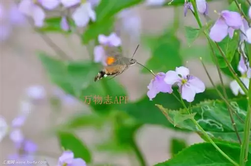 蜂鸟鹰蛾(学名:Macroglossum stellatarum):被称为昆虫世界里的“四不像”,像蝶,和蝶一样白天活动,口器是长长的喙管,且有尖端膨大的触角,还有色彩缤纷、美丽炫目的翅膀。独特而强壮,有灰褐色前翅,其上饰有黑色纹线,两性相似。幼虫白色,身体肥硕,头很小呈黑色。在干枯的瓜蒌藤中越冬。