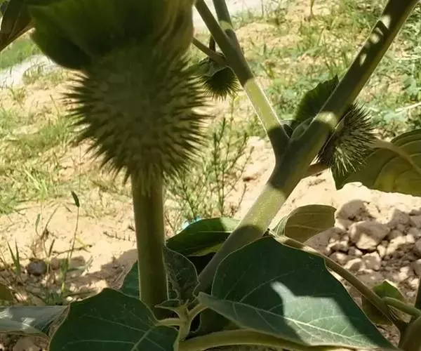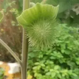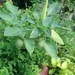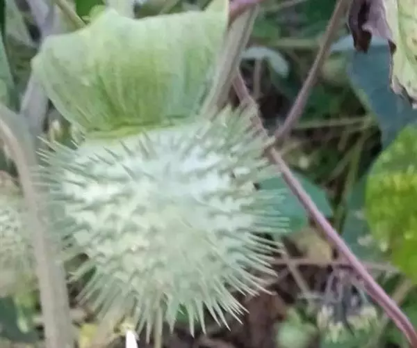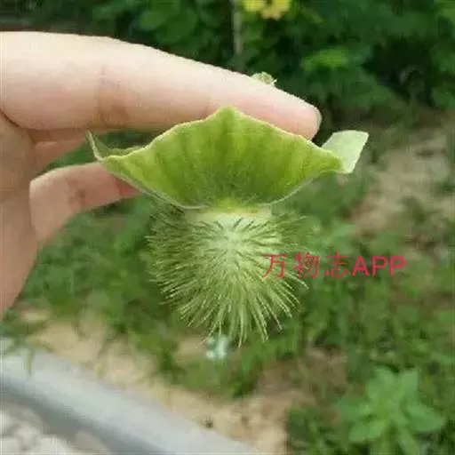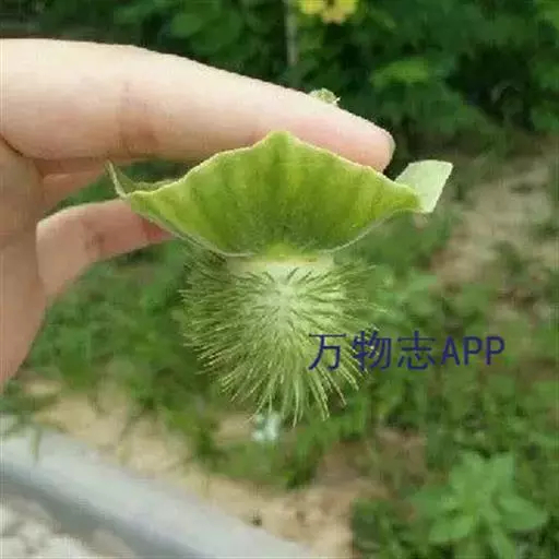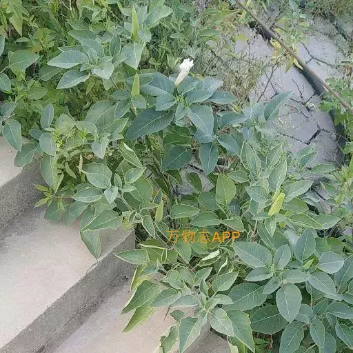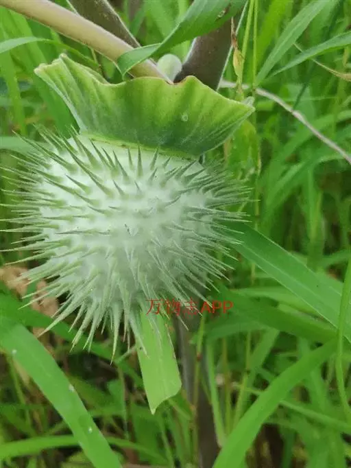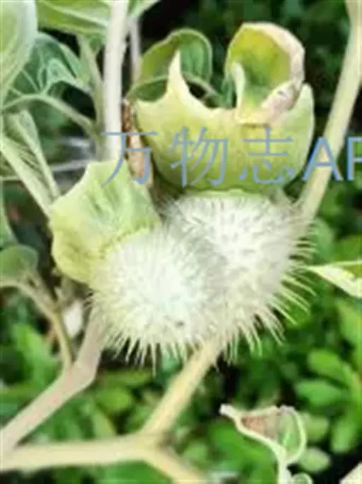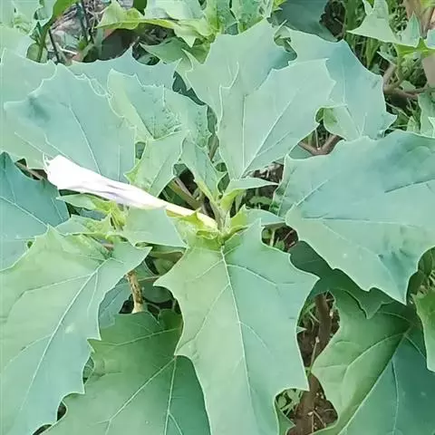 毛曼陀罗 一年生直立草本或半灌木状,高1-2米,全体密被细腺毛和短柔毛。茎粗壮,下部灰白色,分枝灰绿色或微带紫色。叶片广卵形,长10-18厘米,宽4-15厘米,顶端急尖,基部不对称近圆形,全缘而微波状或有不规则的疏齿,侧脉每边7-10条。花单生于枝叉间或叶腋,直立或斜升;花梗长1-2厘米,初直立,花萎谢后渐转向下弓曲。花萼圆筒状而不具棱角,长8-10厘米,直径2-3厘米,向下渐稍膨大,5裂,裂片狭三角形,有时不等大,长1-2厘米,花后宿存部分随果实增大而渐大呈五角形,果时向外反折;花冠长漏斗状,长15-20厘米,檐部直径7-10厘米,下半部带淡绿色,上部白色,花开放后呈喇叭状,边缘有10尖头;花丝长约5.5厘米,花药长1-1.5厘米;子房密生白色柔针毛,花柱长13-17厘米。蒴果俯垂,近球状或卵球状,直径3-4厘米,密生细针刺,针刺有韧曲性,全果亦密生白色柔毛,成熟后淡褐色,由近顶端不规则开裂。种子扁肾形,褐色,长约5毫米,宽3毫米。花果期6-9月。