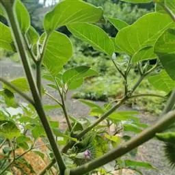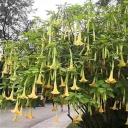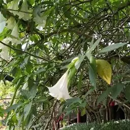毛曼陀罗(学名:Datura innoxia Mill.)又名:凤茄花、串筋花,属管状花目,茄科一年生直立草本或半灌木状,高1-2米,茎粗壮,下部灰白色,叶片广卵形,花单生于枝叉间或叶腋,直立或斜升;花萼圆筒状而不具棱角,花冠长漏斗状,蒴果俯垂,近球状或卵球状,种子扁肾形,褐色,花果期6-9月。