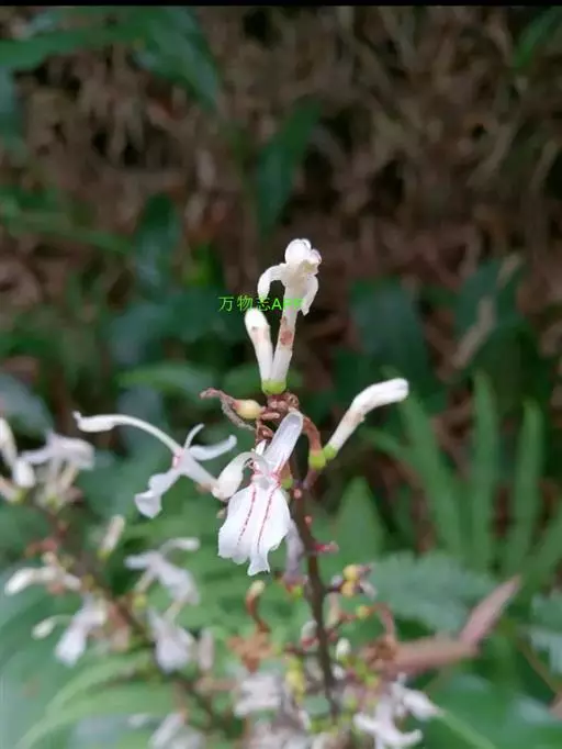 花组成狭圆锥花序,长15-30厘米,分枝短,长3-10毫米,其上有花2-4朵;小苞片长1-3毫米,花时脱落;花白色,萼管状,长5毫米,顶端具3齿;花冠管略超出,花冠裂片长圆形,长约6毫米,后方的1枚稍较大,兜状;唇瓣卵形,长6-7毫米,顶端微凹,侧生退化雄蕊2枚,钻状,长约1毫米;花丝长约5毫米,花药长约3毫米;子房无毛。