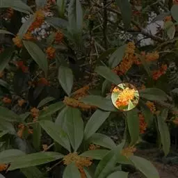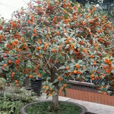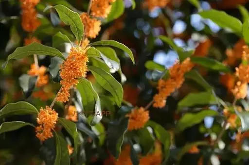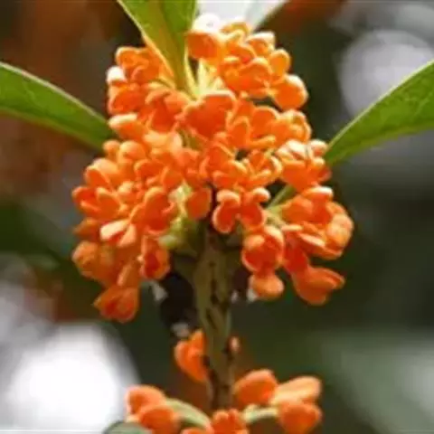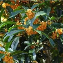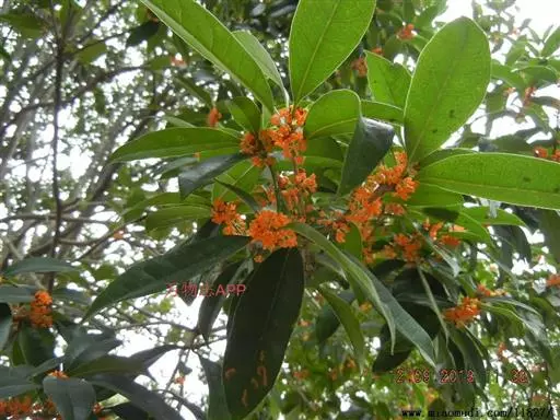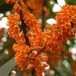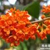 丹桂,又名:木犀、桂花;拉丁文名:Osmanthus fragrans (Thunb.) Lour. 捩花目、木犀科、木犀属常绿乔木,雌雄异株,叶长椭圆形,开橘红色花,香味很浓,树冠圆球形,枝条峭立,紧密度中等。树皮浅灰色,皮孔圆或椭圆形,数量中等,是珍贵的观赏植物。