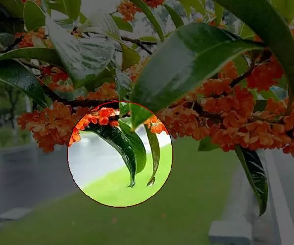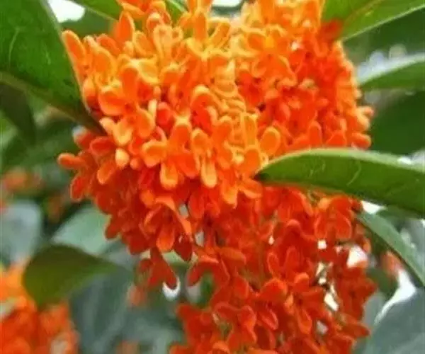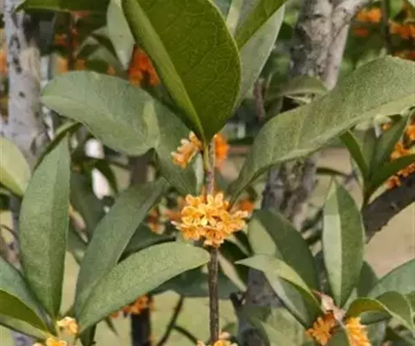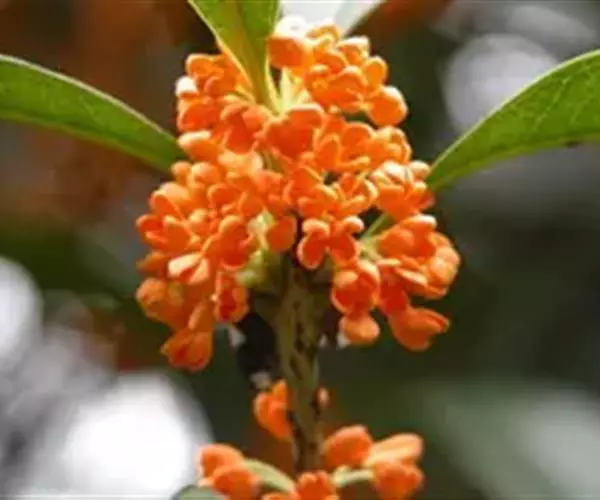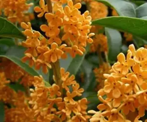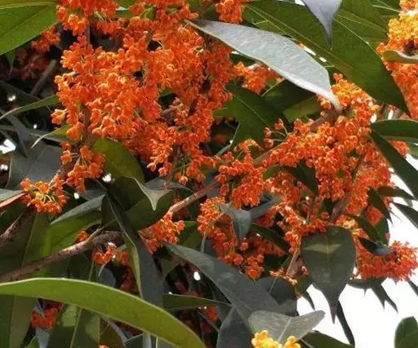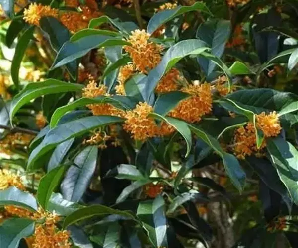 聚伞花序簇生于叶腋,或近于帚状,每腋内有花多朵;苞片宽卵形,质厚,长2-4毫米,具小尖头,无毛;花梗细弱,长4-10毫米,无毛;花极芳香;花萼长约1毫米,裂片稍不整齐;花冠黄白色、淡黄色、黄色或桔红色,长3-4毫米,花冠管仅长0.5-1毫米;雄蕊着生于花冠管中部,花丝极短,长约0.5毫米,花药长约1毫米,药隔在花药先端稍延伸呈不明显的小尖头;雌蕊长约1.5毫米,花柱长约0.5毫米。果歪斜,椭圆形,长1-1.5厘米,呈紫黑色。花期9-10月上旬,果期翌年3月。