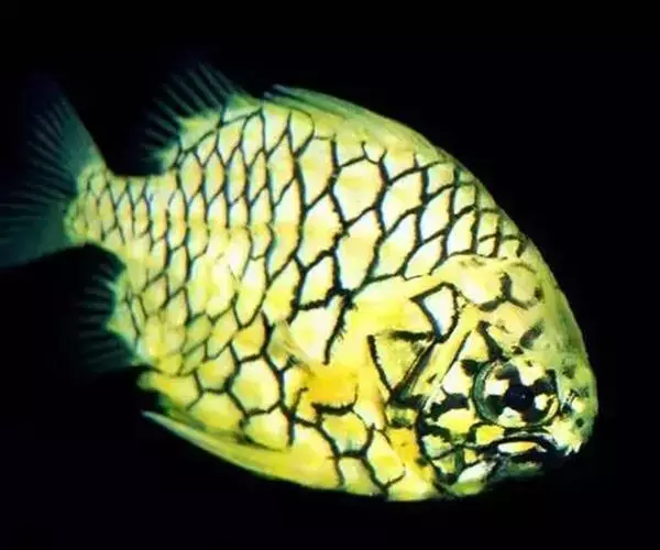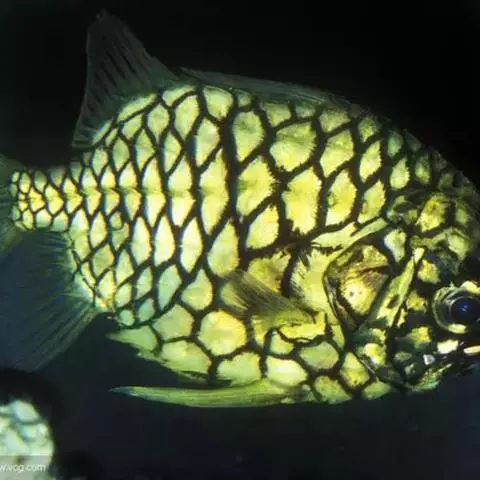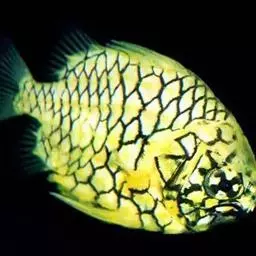 松球鱼为暖水性底层海鱼,因体被大栉鳞、形似松果球而得名。在它头部的发光器官中与其共生着费氏弧菌。当细菌的浓度达到一定程度,便开始发光,便于在黑暗的海洋中寻找并捕食猎物。松球鱼(pinecone fish)又叫凤梨鱼(Pineapple Fish),是金眼鲷目中最漂亮的一种观赏鱼类。