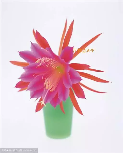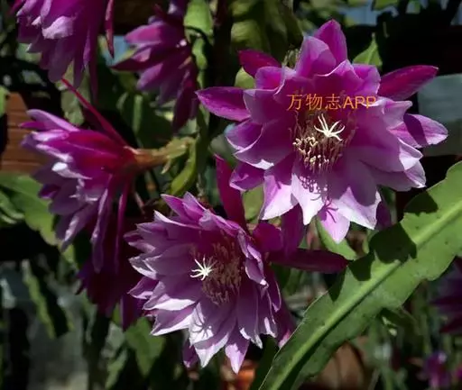 令箭荷花(图8) 附生类仙人掌植物,茎直立,多分枝,群生灌木状,高约50~100厘米。植株基部主干细圆,分枝扁平呈令箭状,绿色。茎的边缘呈钝齿形。齿凹入部分有刺座,具0.3~0.5厘米长的细刺,并生有丛状短刺。扁平茎中脉明显突出。花大型,从茎节两侧的刺座中开出,花筒细长,喇叭状,花被重瓣或复瓣,白天开花,夜晚闭合,一朵花仅开1~2天,花色有紫红、大红、粉红、洋红、黄、白、蓝紫等,夏季白天开花,花期为4~6月。果实隗椭圆形红色浆果,种子黑色。