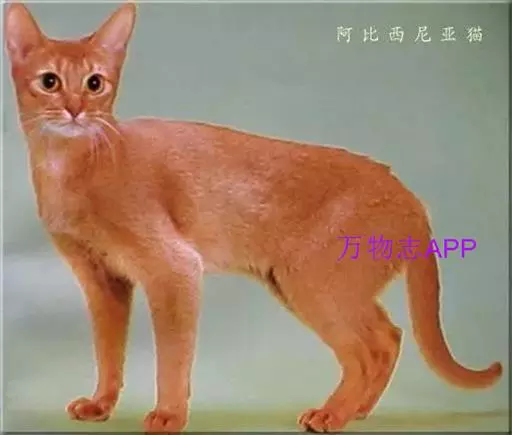 大约在1860年,古埃及猫被一位英国军官从阿比西尼亚(今埃塞俄比亚)带回英国。经过许多养猫爱好者精心培育完善,使其迅速传播开来。但直到1929年才建立了此类猫的品种标准,既而成立了阿比西尼亚猫爱好者俱乐部。由于第二次世界大战以及1960年和1970年猫白血病的大流行,几乎使此猫在英国绝迹。后来又从国外引进,经过精心培育,形成了今天的阿比西尼亚猫。改良过的阿比西尼亚猫,身体修长,四肢高而细,尾长而尖,头略尖,眼大而圆,眼睛为金黄色、绿色或淡褐色,耳朵大且直力,耳内长毛。毛短,毛色漂亮,最常见的毛色是黄褐色,间有黑色杂毛。被毛细密,绒毛层较发达,富有弹性。这种猫喜欢独居,善爬树,体态轻盈,性情温和,很通人性,是非常理想的伴侣。值得一提的是阿比西尼亚猫的那宛如小狮子似的外表显得它更加可爱,而且非常聪明,叫声小而悦耳。无论你住在公寓还是家属楼都可以放心的饲养这种猫。