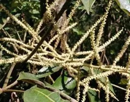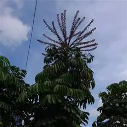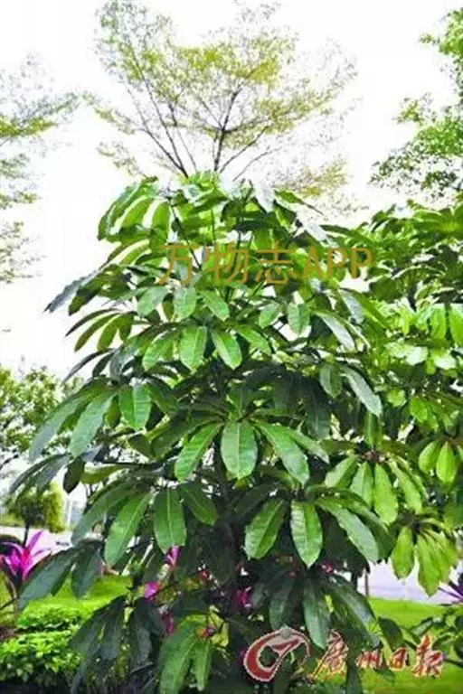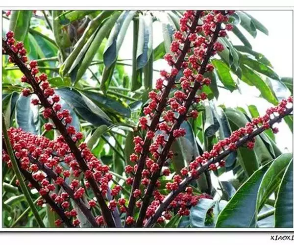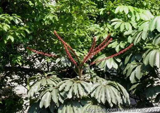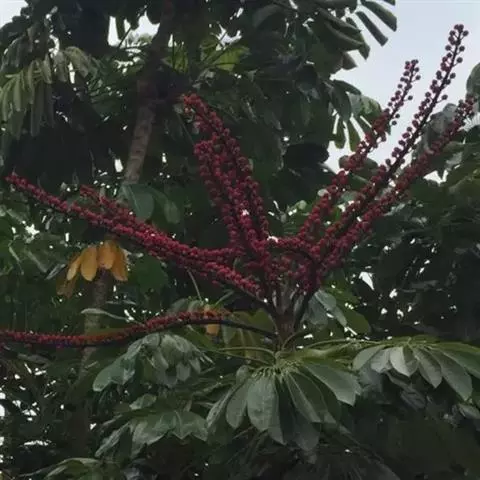 常绿乔木,高达12m。掌状复叶互生,小叶长椭圆形,全缘。花小,红色,总状花序。核果近球形,紫红色。