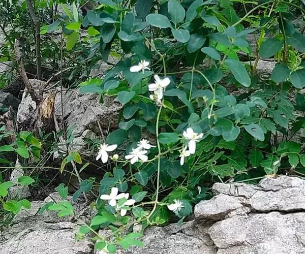 聚伞花序或为总状、圆锥状聚伞花序,有花3至多朵或花单生,腋生或顶生;花序梗、花梗有较密短柔毛;花直径1.5-2.5厘米;萼片4或5-6,开展,白色,倒卵状长圆形,长0.8-1.5厘米,宽3-7毫米,顶端常呈截形而微凹,外面有短柔毛,边缘密生绒毛,内面无毛;雄蕊无毛。