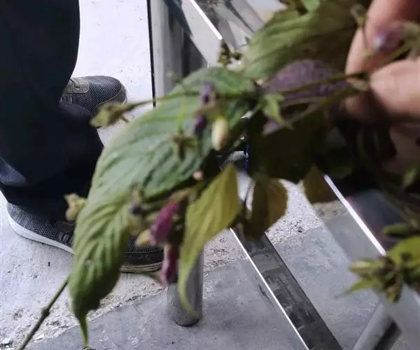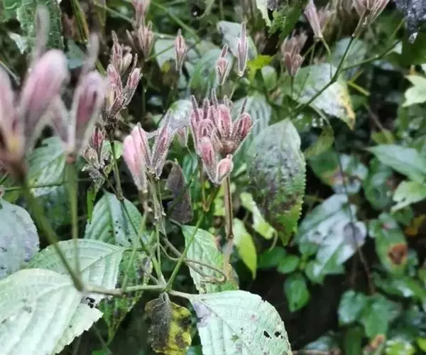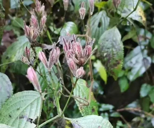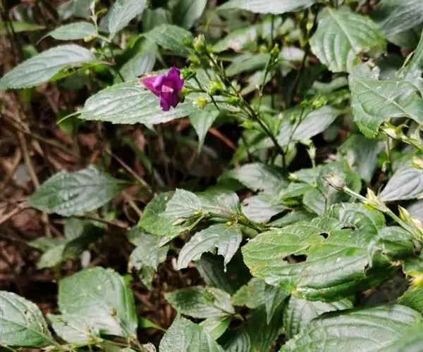圆苞金足草多年生草本,高40-100cm。茎暗紫色,有棱,节膨大,叶对生;柄长1-4.5cm;叶片卵状椭圆形或椭圆形,长7-15cm,宽3-5cm,上部对生叶一大一小,先端长渐尖,基部楔形,边缘有锯齿,上面深绿色,脉上有短毛,下面苍绿色。花3-5朵集成头状花序;花序外有数个苞片,苞片卵状椭圆形,早落;花萼裂片5,深裂几达基部,裂片线状披针形,长7-9mm,结果时增长约达16mm,被腺毛;花冠淡红紫色,长约4cm,稍弯曲,外被短柔毛,内面无毛或在喉部有2行短柔毛,裂片5,几相等;雄蕊4,外侧一对花丝很长,内侧一对花丝极短,花丝基部有膜相连;子房上位,被毛,柱头稍弯。蒴果长1-1.8cm,有腺毛,种子4颗,长椭圆形,有微毛。花期9-10月。