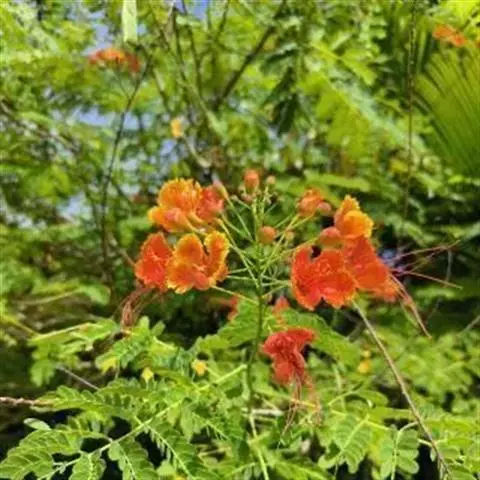 洋金凤 Sw.),豆科小凤花属灌木状或小乔木植物,枝无毛,绿或粉绿色;二回羽状复叶;总状花序伞房状,…