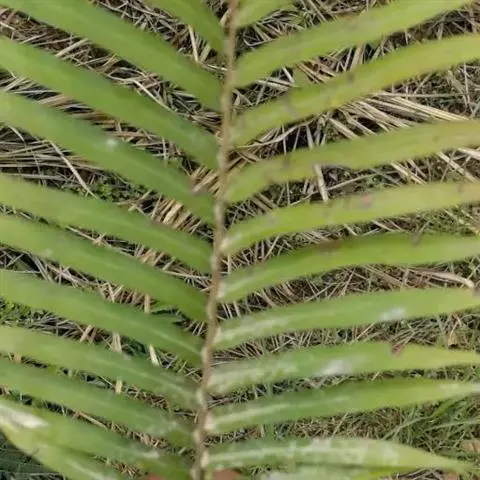 植株高18-60厘米。根状茎直立,粗短,或长而斜生,密被鳞片;鳞片披针形,长约6毫米,先端纤维状,边缘全缘或偶有少数小齿牙,棕色或中部为深褐色,有光泽,厚膜质。叶簇生,二形;柄长3-24厘米,粗1-2毫米,禾秆色,基部密被与根状茎上同样的鳞片,向上渐变光滑;叶片线状披针形,两端渐狭,长14-45厘米,中部以上宽2-(-6)厘米,一回羽状;羽片多数,篦齿状排列,下部羽片向基部逐渐缩小,基部一对成为小耳形,向上的羽片为状披针形,长1.5-3厘米,宽4-6毫米,尖头,基部与叶轴合生,边缘全缘,干后略内卷,平展,彼此接近或略疏离。叶脉不明显,在羽片上为羽状,小脉斜向上,二叉,不达叶边。叶坚革质,干后暗绿色或带棕色,无毛,上面有时呈皱褶状;叶轴禾秆色,光滑,上面有浅纵沟。能育叶与不育叶同形而较狭;孢子囊群线形,着生于主脉与叶缘之间,沿主脉两侧各1行,几与羽片等长,但不达羽片基部及先端;囊群盖纸质,拱形,与孢子囊群同形并紧孢子囊群,开向主脉,宿存。 其孢子母细胞减数分裂浓缩期有33个双价体,每个孢子囊产生64个孢子,是个有性生殖的二倍体。