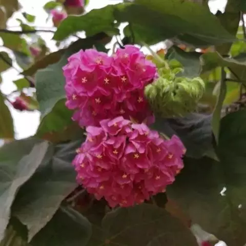 瓶树的叶型由披针形至掌状,有极大的变异,苗木时为深裂的掌状叶,成株逐渐转变以披针形的叶为主,花似风铃,成熟的蓇葖果开裂为船型,花果隐蔽在枝叶中,并不明显。树干上半部的树皮仍保持绿色,具有行光合作用的功能,下半部的树皮龟裂,触感相当坚硬。 肉质灌木,茎干矮肥,肉质,基部膨大。叶掌状盾形,3裂至5裂,叶痕大。花聚生于枝顶,橙红色,五瓣,花梗分枝似珊瑚。株高40 - 50厘米,茎干基部膨大呈卵圆状棒形,上部二歧分枝,叶6-8片簇生于枝顶,盾形,3浅裂,光滑,稍具蜡质白粉。花序重复二歧分枝,长约15厘米,花鲜红色。 叶子碧绿碧绿的,造型独特,每片叶子都分出五个叶面,四个叶面两两相对,还有一个独立在他们的上面,远远看去就好像小巧玲珑的扇子。每到四月,它就会开花。火红火红的小小的花瓣从茂盛的枝叶间探出头来张望这美丽的世界,它好象在说:“时间多美丽呀!” 瓶树最有趣的是它的枝干。圆鼓鼓的,好似弥勒佛的大肚子一样!它株形奇特,一年四季开花不断,是中国栽培已久的室内盆栽佳品。