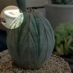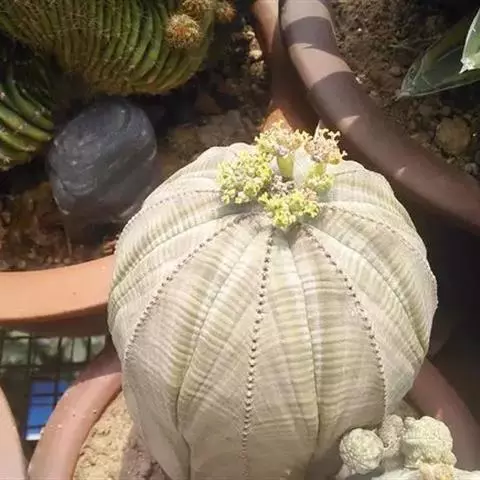 布纹球,是大戟科大戟属植物。植株小球形,表皮灰绿色,中有红褐色,…