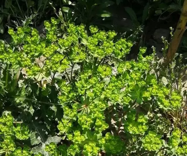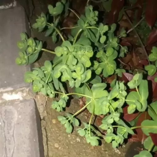一年生或二年生草本,高10~750px,全株含乳汁。茎基部分枝,带紫红色。叶互生,倒卵形或匙形,长1~75px,宽0.7~25px,先端微凹,边缘中部以上有细锯齿,无柄。茎顶有5片轮生的叶状苞;总花序多歧聚伞状,顶生,有5伞梗,每伞梗生3个小伞梗,每小伞梗又第3回分为2叉; 杯状聚伞花序钟形,总苞顶端4裂,裂间腺体4,肾形;子房3室,花柱3。蒴果无毛。种子卵形,表面在凸起的网纹。花期4~5月,果期6~7月。生于沟边、路旁、田野。分布于除新疆、西藏以外的全国各省区。