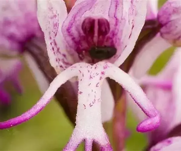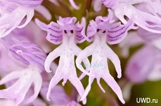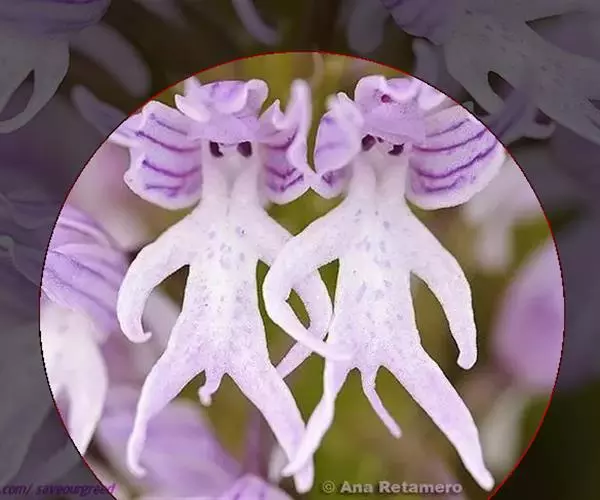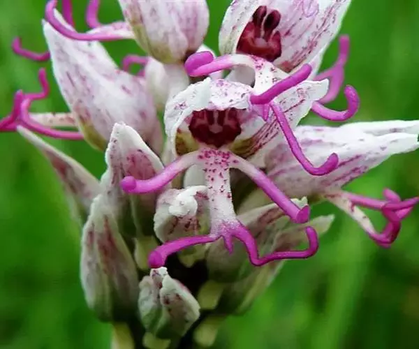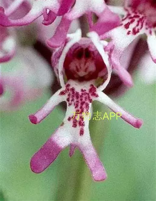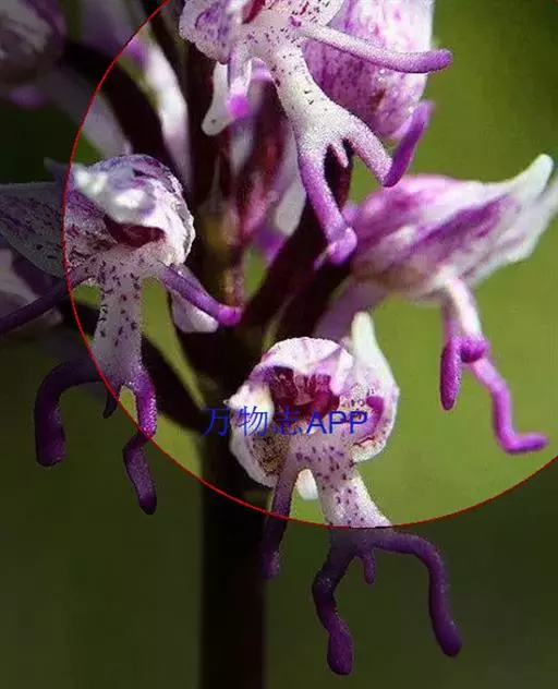 意大利红门兰,拉丁学名叫“Orchis italica”,整朵花的造型就像一个戴着草帽的裸体男人。因外观呈人形,英语里又称“Italian man orchid”,即“意大利男人兰”,或者“pyra-mid monkey orchid”,即“金字塔猴子兰”。此外,它还有一个源自古希腊文的名字为“睾丸兰”。