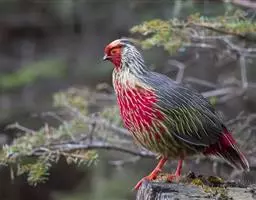 体大的灰褐色鹑类。胸灰色具黑色细纹。与相似种类四川雉鹑不同处在于栗色喉块外缘近白。有猩红色眼周裸皮。全长约48cm。雌、雄两性相似。上体大都褐色,翅具白色和淡棕色端斑;颏至前颈及尾下覆羽红栗色;胸、腹褐灰,胸羽还具黑色纵纹,腹羽则杂以淡黄和棕色。