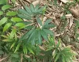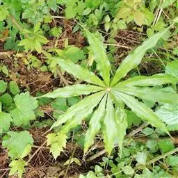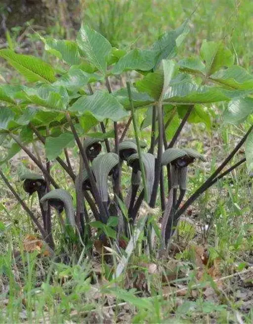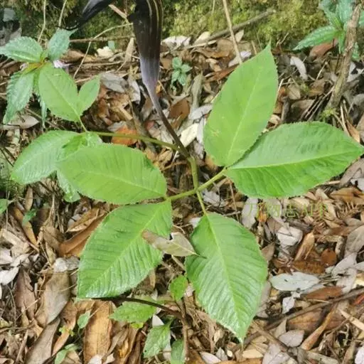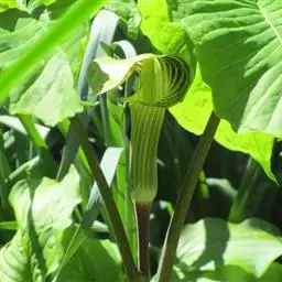 灯台莲:又名粗齿灯台莲。多年生草本。块茎扁球形,直径2-3cm。鳞叶2,内面的披针形,膜质;叶2,叶柄长20-30cm,下面1/2鞘筒状,鞘筒上缘几平截;叶片鸟足状5裂,裂片卵形、卵状长圆形或长圆形,边缘具不规则的粗锯齿至细的啮状锯齿,中裂片具长柄,侧裂片与中裂片近相等,具短柄或否;外侧裂片无柄,不等侧,内侧基部楔形,外侧圆形或耳状。花序柄通常短于叶柄或几等长。佛焰苞淡绿色至暗紫色,具淡紫色条纹,管部漏斗状,喉部边缘近截形,无耳;檐部卵状披针形,稍下弯;肉穗花序单性;雄花序圆柱形,花疏,雄花药2-3,药室外向纵裂;雌花序近圆锥形,花密,子房卵圆形,柱头小;各附属器具细柄,上部增粗成棒状或近球形。浆果黄色,长圆锥状。种子卵圆形,具柄。花期5月,果期8-9月。