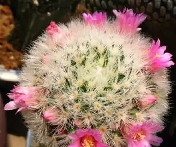 玉翁 玉翁 多年生肉质草本。植株单生,圆球形至椭圆形,体色鲜绿。高度20厘米以下,球径15厘米以下,具13~21个圆锥形的疣状突起,呈螺旋形排列的棱,疣腋间有15~20根3~4厘米长的白毛,新刺座有白色茸毛,白色刚毛状辐射周刺30~35枚,尖端褐色的中刺2~3枚。春季桃红色小型钟状花围绕球成圈开放,花径1~1.5厘米。
