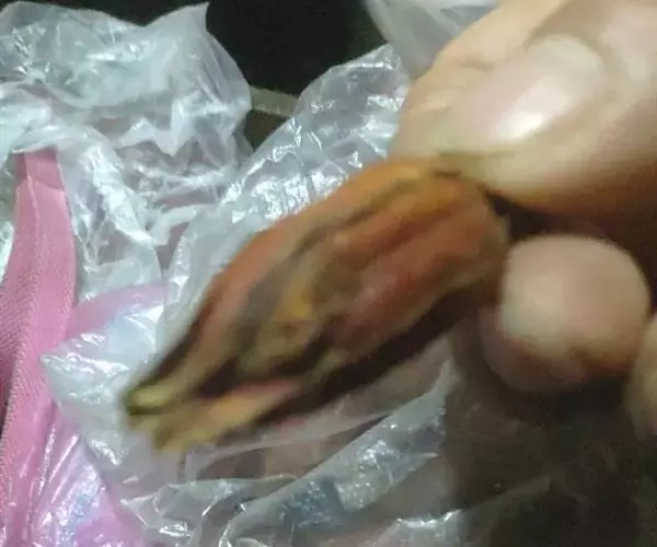 (2)将鸭颈刀口处的鸭皮翻起,用左手拉住食管、气管,右手的大拇指顺着鸭颈皮下的食管、气管,轻轻捅至鸭膀的上边。再把气管拉断,取出。