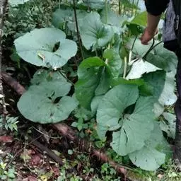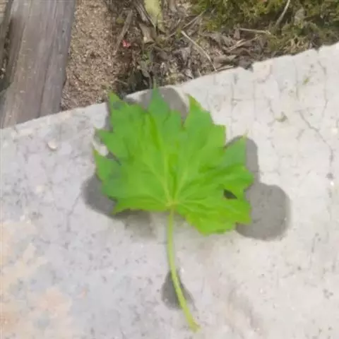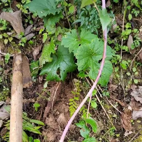 茎细直,直径约5-7毫米,无毛。叶有基部扩大抱茎的长柄,叶片宽过于长,宽16-30厘米,基部稍心形,掌状深裂,裂片约7个,中裂片3裂,侧裂片2-3裂,边缘有疏齿或小裂片,质稍厚,下面浅绿色,两面无毛;上部叶少数,有基部扩大抱茎的短柄,有时有3裂片或不裂而作狭长的苞叶状。