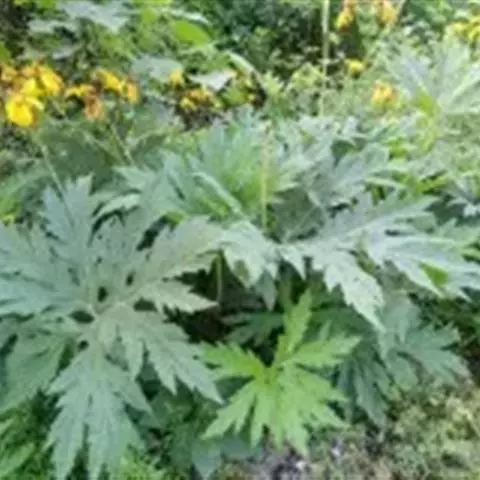 丛生叶与茎下部叶具柄,柄细瘦,长达50厘米,光滑,基部具鞘,叶片轮廓卵形,掌状4-7裂,长4.5-10厘米,宽8-18厘米,裂片3-7深裂,中裂片二回3裂,小裂片边缘具条裂齿,两面光滑,稀被短毛,叶脉掌状;茎中上部叶少而小,掌状分裂,常有膨大的鞘。