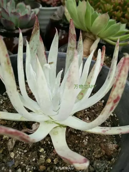 仙女杯 布瑞东尼 Dudleya brittonii,在墨西哥北部近海沿岸,蒂华纳以南,拉米西恩附近均有分布。植物学家布瑞登发现该品种为此命名,故名布瑞东尼,也有以其叶片宽大特征,直接叫做宽叶仙女杯。 仙女杯 布瑞东尼 这基本上是众人所知,园艺培养、家庭养殖,最为常见的一种仙女杯品种,形态多变,肉质叶片上白粉浓厚,白色纯净,上佳植株微现翠绿叶色。此品种分2种季节形态,视生长环境等因素(迄今研究尚无定论)。一种形态为叶面着浓厚白粉,一种形态为翠绿叶面极微量粉形态。花期四月至七月,花开黄色,染色体为N.17。 仙女杯 布瑞东尼属大型品种,不怕折腾,易于盆栽,亦益于盆栽。因为以此品种为母本或者副本的杂交品种较多,所以植株幼苗期难以分辨,购买时需确认母本父本以便保证购买为意向所需。 仙女杯 布瑞东尼 Dudleya brittonii在美国加州珲廷顿植物园