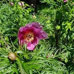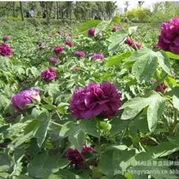 葛巾紫(学名:Paeonia suffruticosa ‘Gejin Zi’):落叶灌木。茎高,分枝短。叶通常为二回三出复叶,顶生小叶宽卵形,表面绿色,无毛,背面淡绿色,有时具白粉,沿叶脉疏生短柔毛或近无毛。花单生枝顶,苞片5,长椭圆形,大小不等;萼片5,绿色,宽卵形,大小不等;花瓣为重瓣,颜色紫色,绣球型,顶端呈不规则的波状;花丝上部白色,花药长圆形,花盘革质,杯状,紫红色;心皮5,密生柔毛。蓇葖长圆形,密生黄褐色硬毛。花期5月;果期6月。