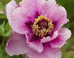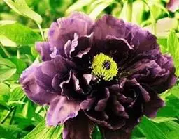 花单生枝顶,紫色,绣球型,有时呈蔷薇型。花径18厘米×6厘米。顶端呈不规则的波状;花蕾扁圆形;花瓣质地薄软皱卷。瓣基具深紫红色晕;雄蕊部分瓣化;雌蕊退化变小。中花品种。花梗细长而软,侧开,花梗长4-6厘米;苞片5,长椭圆形,大小不等;萼片5,绿色,宽卵形,大小不等;雄蕊长1-1.7厘米,花丝紫红色、粉红色,上部白色,长约1.3厘米,花药长圆形,长4毫米;花盘革质,杯状,紫红色,顶端有数个锐齿或裂片,完全包住心皮,在心皮成熟时开裂;心皮5,稀更多,密生柔毛。蓇葖长圆形,密生黄褐色硬毛。花期5月;果期6月。
