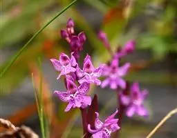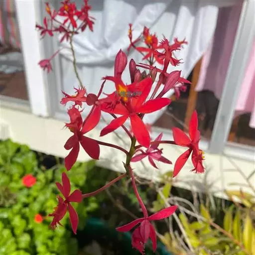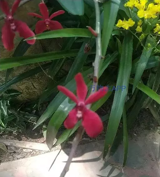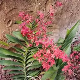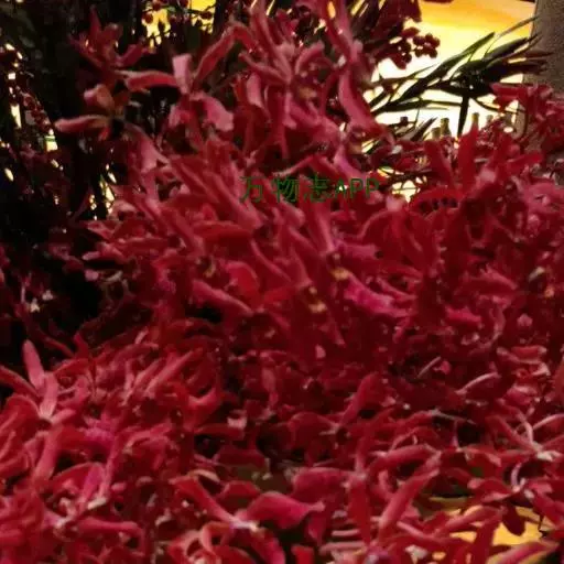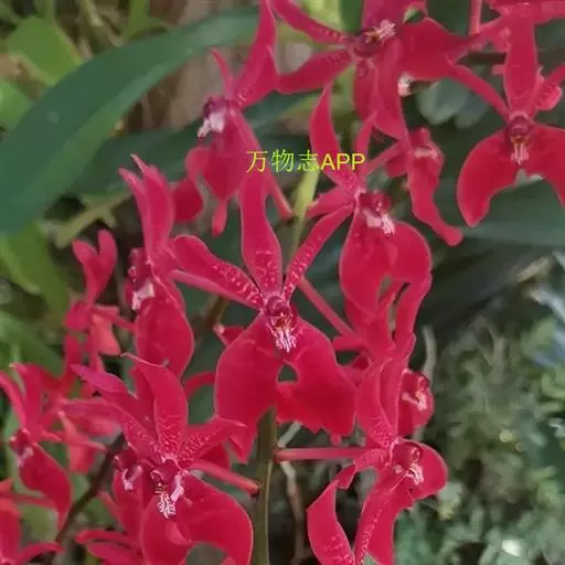火焰兰(学名:Renanthera coccinea Lour.):茎攀援,粗壮,质地坚硬,圆柱形,长1米以上,粗约1.5厘米,通常不分枝。叶二列,斜立或近水平伸展,舌形或长圆形。花序与叶对生,常3-4个,粗壮而坚硬,圆锥花序或总状花序疏生多数花;花火红色,开展;花瓣相似于中萼片而较小,先端近圆形,边缘内侧具桔黄色斑点;唇瓣3裂。花期4-6月。