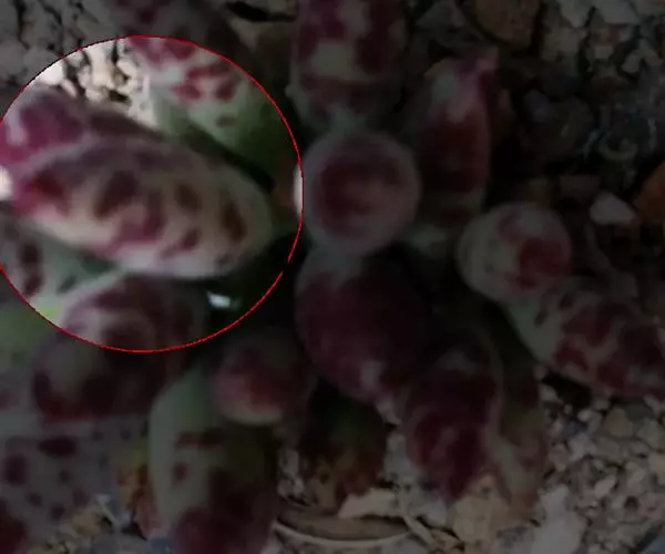 为多年生肉质植物,植株呈灌木状,通常在基部分枝,茎圆柱形,直立生长。肉质叶交互对生,无柄,叶片倒卵形,叶缘有不规则的波状齿,长约10厘米,蓝灰至灰绿色,被有一层薄薄的白粉,表面有红褐至紫褐色斑点或晕纹。
