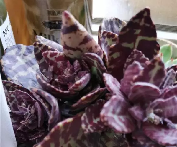 江户紫叶片肥厚,灰绿或蓝绿色叶面上布满了紫褐色斑点,犹如一块美丽的调色板,是多肉植物中的观叶佳品,大型植株可供布置温室、植物园中的沙漠生态景观,江户紫叶片有独特的色调,是多肉植物中的观叶佳品,家庭栽培可以美化阳台、窗台、客厅、书房,奇特可爱。适合家庭栽种。