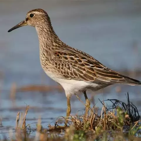 阔嘴鹬是涉禽,体长17厘米。特征为翼角常具明显的黑色块斑并具双眉纹。与黑腹滨鹬平滑下弯的嘴相比,…