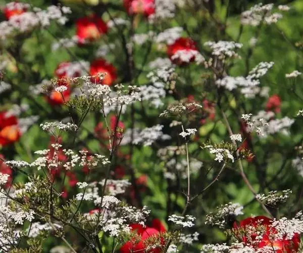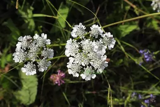 复伞形花序直径2.5-8厘米,伞辐4-15。不等长;小总苞片5-8,卵形至披针形,顶端尖锐,反折,边缘有睫毛或近无毛;花白色,通常带绿或黄色;花柱较花柱基长2倍。