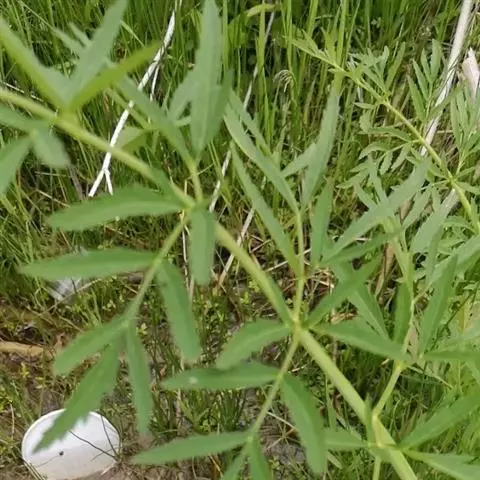 基生叶有长柄,柄长5-20厘米,基部有长约4厘米,宽约1厘米的鞘;叶片轮廓呈卵形,2回羽状分裂,长10-30厘米,一回羽片有长柄,卵形至宽卵形,长4-12厘米,宽2-8厘米,有2回羽片3-4对,2回羽片有短柄,轮廓卵状披针形,长2-6厘米,宽1.5-4厘米,羽状全裂或深裂,末回裂片卵形或椭圆状卵形,有粗锯齿,长1-3厘米,宽0.5-1.5厘米。背面疏生柔毛;茎上部叶有短柄或无柄,基部呈鞘状,有时边缘有毛。
