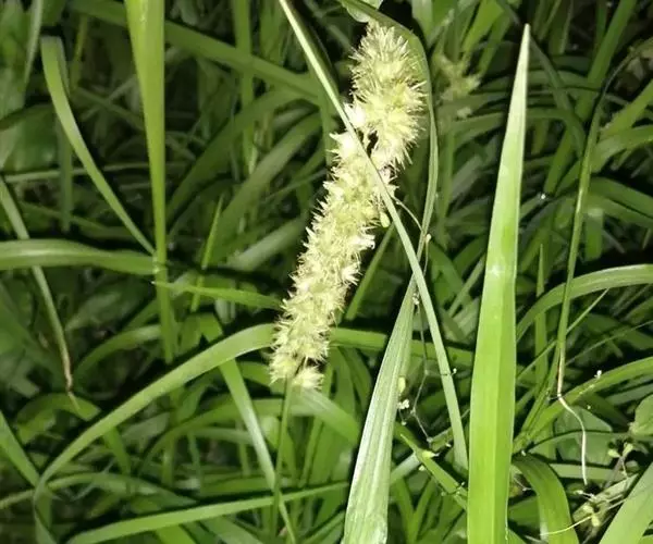 总状花序直立,长4-8厘米,宽约1厘米;花序主轴具稜粗糙;刺苞呈稍扁圆球形,长5-7毫米,宽与长近相等,刚毛在刺苞上轮状着生,具倒向粗糙,直立或向内反曲,刺苞背部具较密的细毛和长绵毛,刺苞裂片于1/3或中部稍下处连合,边缘被平展较密长约1.5毫米的白色纤毛,刺苞基部收缩呈楔形,总梗密具短毛,每刺苞内具小穗2-4(-6)个,小穗椭圆状披针形,顶端较长渐尖,含2小花;颖薄质或膜质,第一颖三角状披针形,先端尖,长为小穗的1/2,具1脉;第二颖长为小穗的3/4-2/3,具5脉;第一小花雄性或中性,第一外稃与小穗等长,具5脉,先端尖,其内稃狭长,披针形,长为其第一外稃2/3,第二小花两性,第二外稃具5脉,包卷同质的内稃,先端尖,成熟时质地渐变硬;鳞被缺如;花药长约1毫米,顶端无毫毛;柱头帚刷状,长约3毫米。