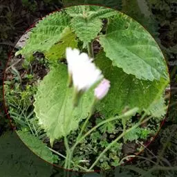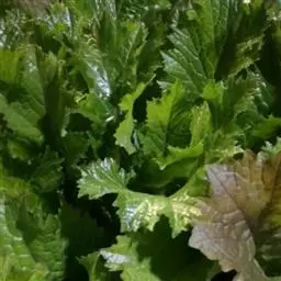 基生叶倒卵形或宽倒卵形,长20-30厘米,坚实,深绿色,有光泽,基部渐狭成宽柄。全缘或有不显明圆齿或波状齿。中脉白色。宽达1.5厘米,有多条纵脉;叶柄长3-5厘米,有或无窄边;下部茎生叶和基生叶相似,基部渐狭成叶柄;上部茎生叶倒卵形或椭圆形,长3-7厘米,宽1-3.5厘米,基部抱茎,宽展,两侧有垂耳,全缘,微带粉霜。