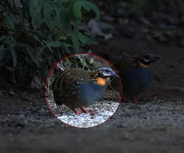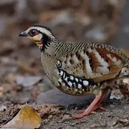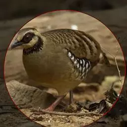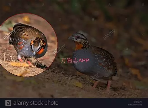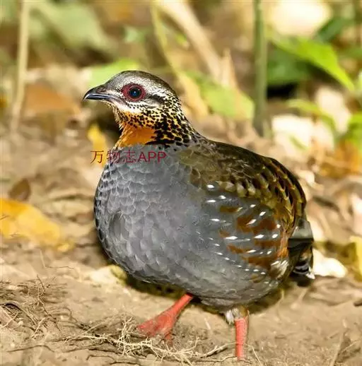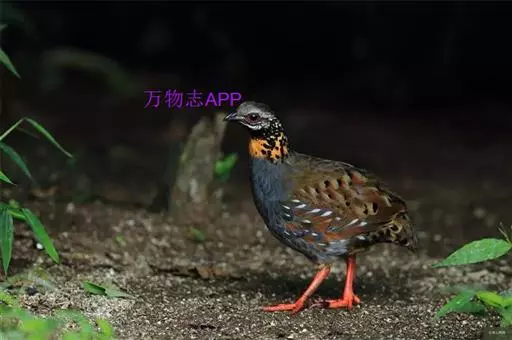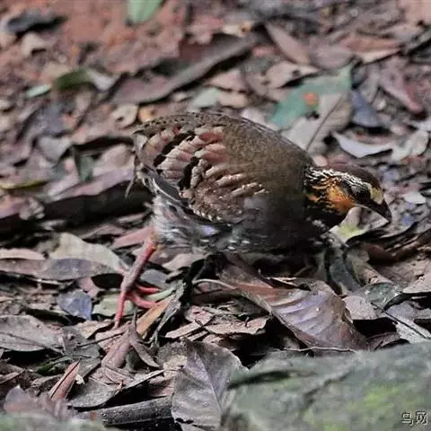 红喉山鹧鸪(学名:Arborophila rufogularis)体长18-28厘米,体重220-340克;雌鸟体长25-30厘米,体重202-300克。额深灰色,宽而长的眉纹灰白色,一直延伸到颈侧,并杂有黑色斑点。眼周裸出的皮肤鲜红色。颏和上喉黑色,下喉棕红色。胸灰色。上体纯橄榄褐色,背部没有任何斑纹,但腰上有三角形黑斑。虹膜褐色,嘴黑色,腿、脚红色。