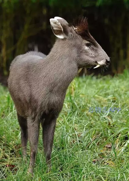 体 毛冠鹿 长约920毫米.尾长约120毫米,肩高490毫米,体重约30公斤左右。体中等大小,与赤鹿相仿、鼻端裸露,眼较小,无额腺,眶下腺特别显著。耳较圆阔。额部有一簇马蹄形的黑色长毛,故称毛冠鹿。雄鹿有角,角极短长度仅1cm左右,且角冠不分叉,尖略向下弯,隐藏在额顶上的一簇长的黑毛丛中;雌鹿无角。尾短。 ‘
