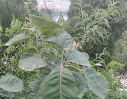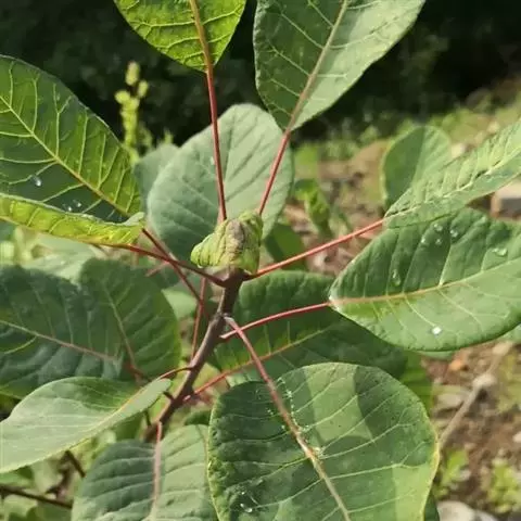 粉背黄栌叶卵圆形,较大,长3.5-10厘米,宽2.5-7.5厘米,无毛,但叶背显著被白粉;叶柄较长,…