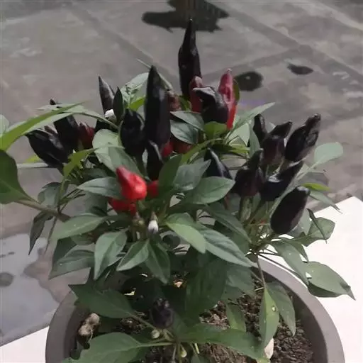 黑弹头辣椒为观赏椒品种。株高60厘米。叶深绿色,茎枝紫色,开紫花。果对生或簇生,呈小圆锥形,形似“子弹头”,味极辣。果长3厘米,果肩直径1.6厘米,果柄长2.5厘米。幼果黑色,成熟果鲜红色。坐果率高,每株可坐果100多个。在盛果期,椒果黑红朝天,如待发的密林防空弹头,颇为壮观。