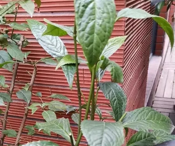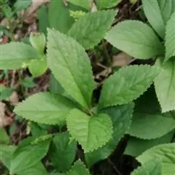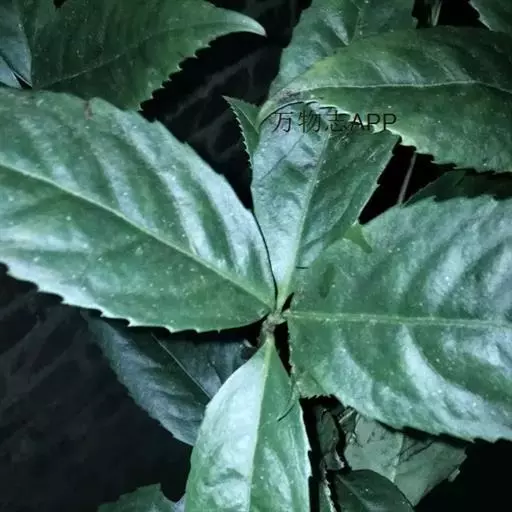 半灌木,直立或稍平卧,高30-60厘米;茎圆柱形,无毛。叶对生,厚纸质,椭圆形或倒卵状椭圆形,长5-11厘米,宽2.5-5.5厘米,顶端急尖或钝,基部楔形,边缘具圆齿状锯齿,齿端有一腺体,腹面深绿色,光亮,背面淡黄绿色,侧脉6-8对,两面稍凸起;叶柄长8-18毫米,基部多少合生;托叶微小。