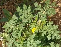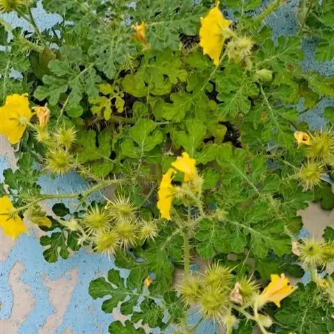 一年生草本,高约0.7米,茎,叶下面,叶柄及花梗均被5-9分枝有柄或无柄的星状绒毛,小枝黑褐色,毛被初时较密,以后逐渐脱落,具疏稀的浅黄色皮刺,皮刺先端深黄褐色,锐尖,基部淡黄色,宽扁,直或微弯,长2-5毫米,基部宽约1-2毫米。上部叶常假双生,不相等,叶片卵形至长圆状卵形,长10-20厘米,宽6-14厘米,先端三角形,渐尖或钝,基部不相等,边缘作不规则的波状深裂,裂片三角形,上面疏被单毛及4-(8)分枝较短的星状绒毛,下面苍白色,常亮绿或暗绿,密被5-9分枝较长的淡黄色或灰绿色星状绒毛,以7-9分枝的较多;中脉在两面均被较密的星状毛及稀疏的钻形直刺,很少有不具的,刺长约3-7毫米,基部稍宽扁,侧脉每边4-7条,很少具有细皮刺;叶柄长约2-7厘米,具有与中脉相似的皮刺。