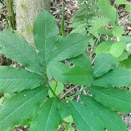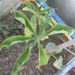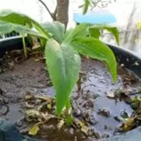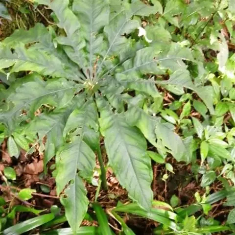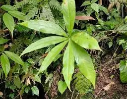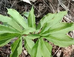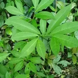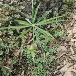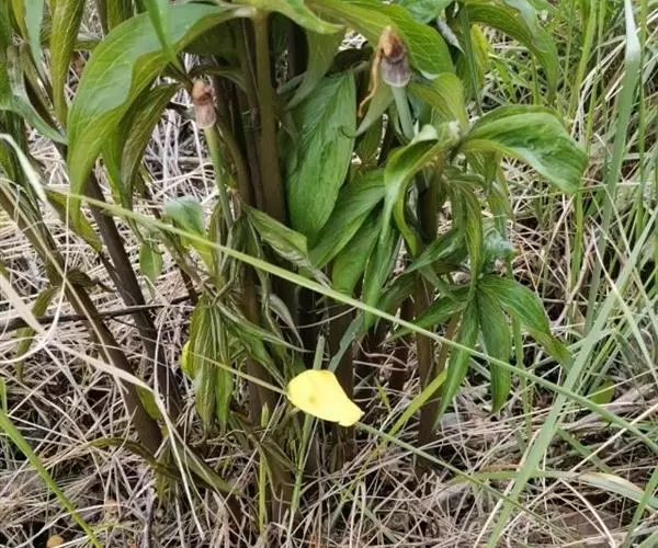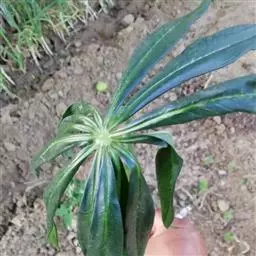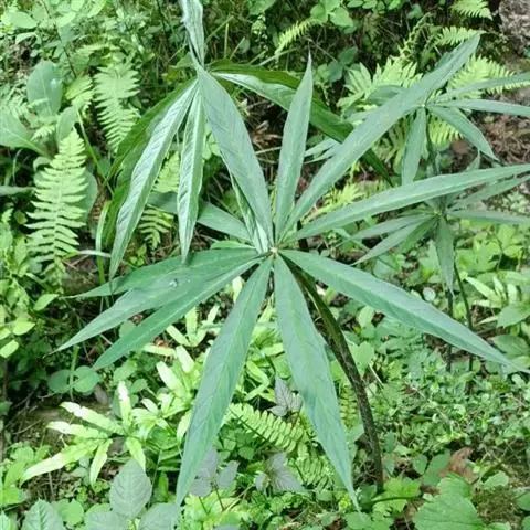 黄苞南星 块茎近球形,小,直径1.5-2.5厘米。鳞叶3-5,锐尖,内面的长8-25厘米。叶2-1,叶柄长12-27厘米,具鞘部分占4/5;叶片鸟足状分裂,裂片5-11(-15),芽时中裂片向上,余向下,长圆披针形或倒卵状长圆形,先端渐尖,基部楔形,长2.5-12厘米,宽0.6-3厘米,亮绿色,侧脉与中肋成锐角上升,细弱,常不连接为整合的集合脉。