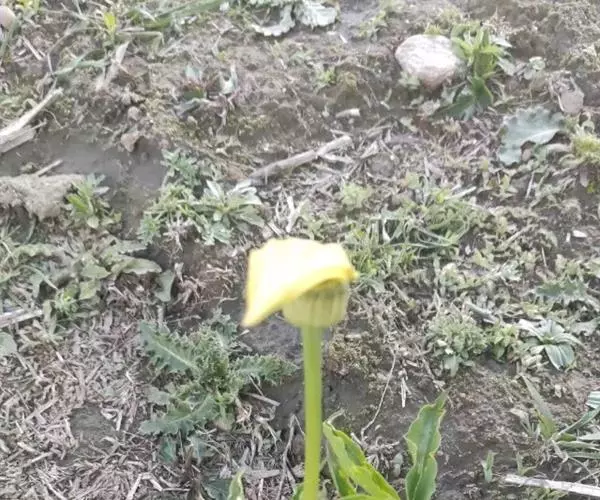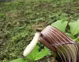 花序柄常先叶出现,长于叶柄,长15-30厘米,绿色。佛焰苞为本属中最小的,长2.5-6厦米,管部卵圆形或球形,长1-1.5厘米,直径1-1.4厘米,黄绿色,喉部略缢缩,上部通常深紫色,具纵条纹;檐部长圆状卵形,长1.5-4.5厘米,宽0.8-2厘米,先端渐狭至锐尖,黄色或绿色,内面至少在下部为暗紫色,略下弯。