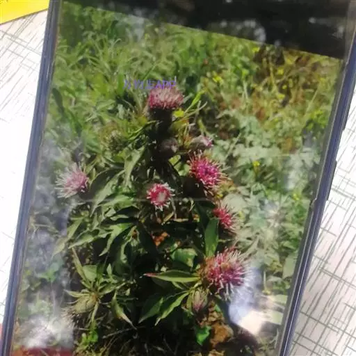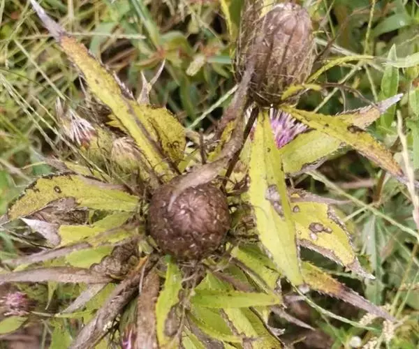 头状花序单生茎枝顶端,植株通常有6-10个头状花序,但不形成明显的花序式排列。苞叶绿色,长3-4厘米,针刺状羽状全裂。总苞大,宽钟状,直径3-4厘米。总苞片9-10层,覆瓦状排列;外层及中外层长卵形或三角形,长6-8毫米;中层披针形或椭圆状披针形,长11-16毫米;最内层宽线形,长2厘米,顶端紫红色。全部苞片顶端钝,边缘有白色蛛丝毛。小花长1.7厘米,紫红色,冠檐5深裂。
