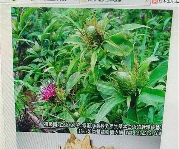 白术(学名:Atractylodes macrocephala Koidz.):菊科苍术属多年生草本植物,高可达60厘米,结节状根状茎。茎直立,全部光滑无毛。叶互生,叶片羽状全裂,侧裂片倒披针形、椭圆形或长椭圆形,顶裂片比侧裂片大,全部叶质地薄,纸质,两面绿色,无毛,头状花序单生茎枝顶端,苞叶绿色,针刺状羽状全裂。总苞宽钟状,顶端紫红色。瘦果倒圆锥状,8-10月开花结果。
