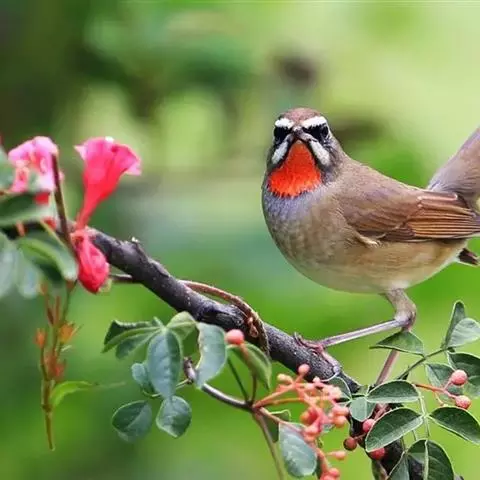 日本歌鸲:体型小似麻雀,但羽毛颜色较为美丽。嘴细长,嘴须不发达;翅短圆,上体草黄褐;雄鸟喉部橙棕色,…
