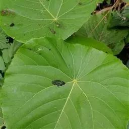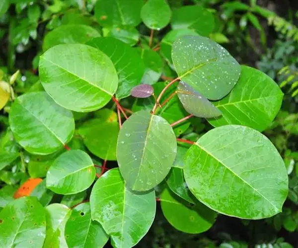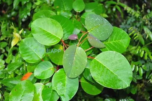 性状鉴别 :叶近圆形,革质,长5.5-11cm,宽6-11.5cm,基部近圆形,先端圆而有小凸尖;叶柄长3-7cm,顶端有2腺体。蒴果近球形,直径约1.5cm,表面紫褐色。内含种子3枚,种子近三角形,外面被蜡质层。气微,味苦涩。