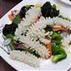 鱿鱼的切法:先从左角开始切,刀和鱿鱼呈45度的角,切那种连皮不要断刀的斜线就可以了;然后换反方向再从右角切交叉的斜线,最后再切成长方型的小块。